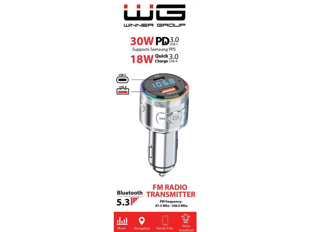 Autonabíječka s PD 3.0 USB-C 30W, QC 3.0 USB-A 18W, Bluetooth 5.3 a FM radio transmitter ve stříbrné barvě je moderní multifunkční zařízení pro nabíjení a zábavu na cestách. S vysokým výkonem a pokročilými funkcemi vám poskytne maximální pohodlí při cestování a zajistí, že vaše zařízení budou vždy nabitá.