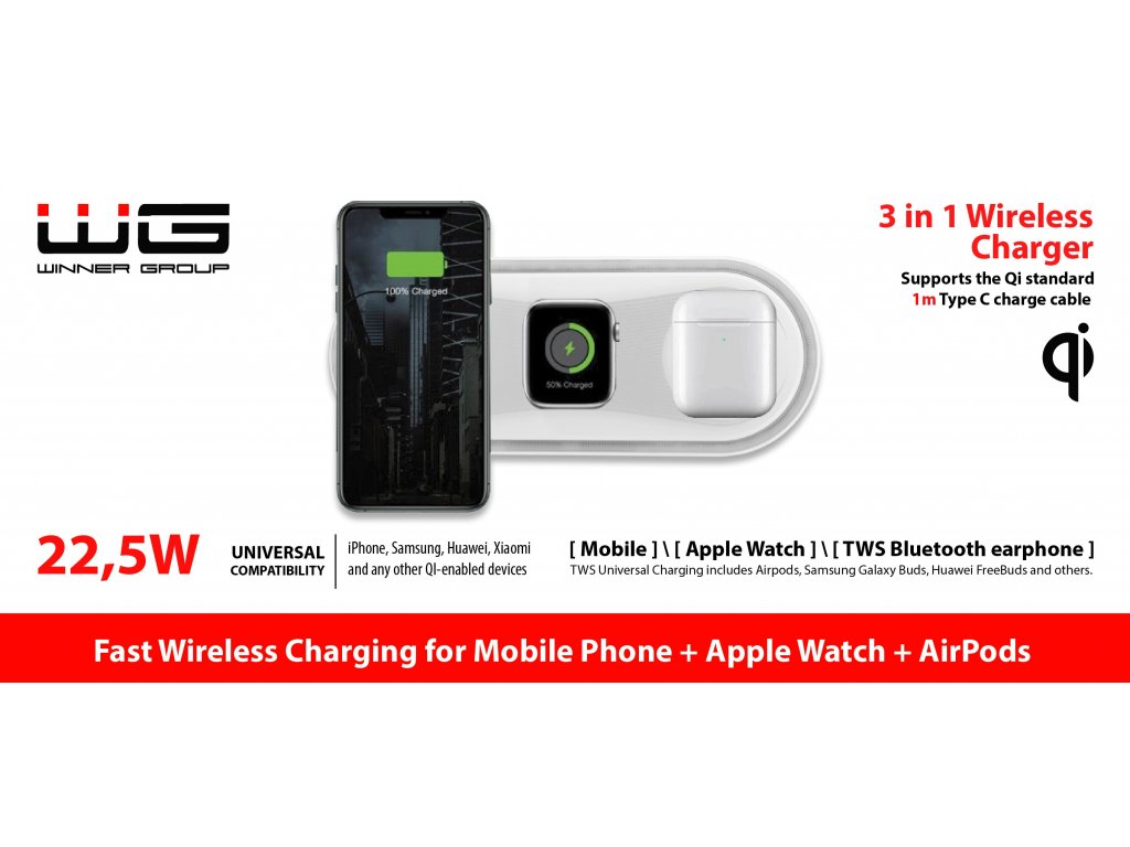Tato bezdrátová nabíječka WG 3v1 vám umožní pohodlně a efektivně nabíjet až tři zařízení současně. Díky podpoře rychlého nabíjení s celkovým výkonem až 22,5 W je ideální pro moderní domácnosti i kanceláře.