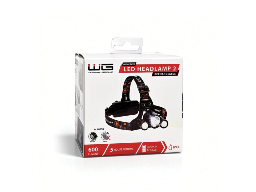 Vynikající, moderní a vysoce účinná čelovka od společnosti Winner Group bude skvělým společníkem při venkovních aktivitách. Je určena pro individuální použití ve tmě nebo v interiéru bez osvětlení. Čelovka vám skvěle poslouží při nejrůznějších dobrodružstvích jako je kempování, sportovní aktivity, noční rybolov, či prozkoumávání tajných chodeb a jeskyň. Kompaktní čelovku si můžete vzít prostě kamkoli, vejde se do batohu i kapsy. Čelovku si nasadíte na hlavu a rázem máte obě ruce volné a můžete je bez omezení používat. Díky možnosti nastavení předních světel směrem dolů až o 105° můžete upravit úhel světla podle vašich potřeb, aby světlo dopadalo přesně na požadované místo. Světlo má jas 600 lumenů a jeho dosah je 300 metrů. Výhodou této čelovky je, že si můžeme vybrat ze dvou variant napájení. Buď použijeme klasické tužkové baterie AAA, které po dosvícení vyměníme za nové, nebo můžeme použít baterie 18650, které po dosvícení dobijeme pomocí přloženého kabelu Micro USB.