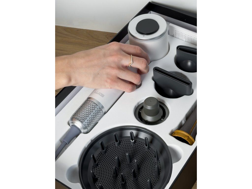 Obsah balení: Fén Elegance Air Pro, magnetický hladký nástavec, stylingový koncentrátor, difuzér, 2x Airwrap nástavce.