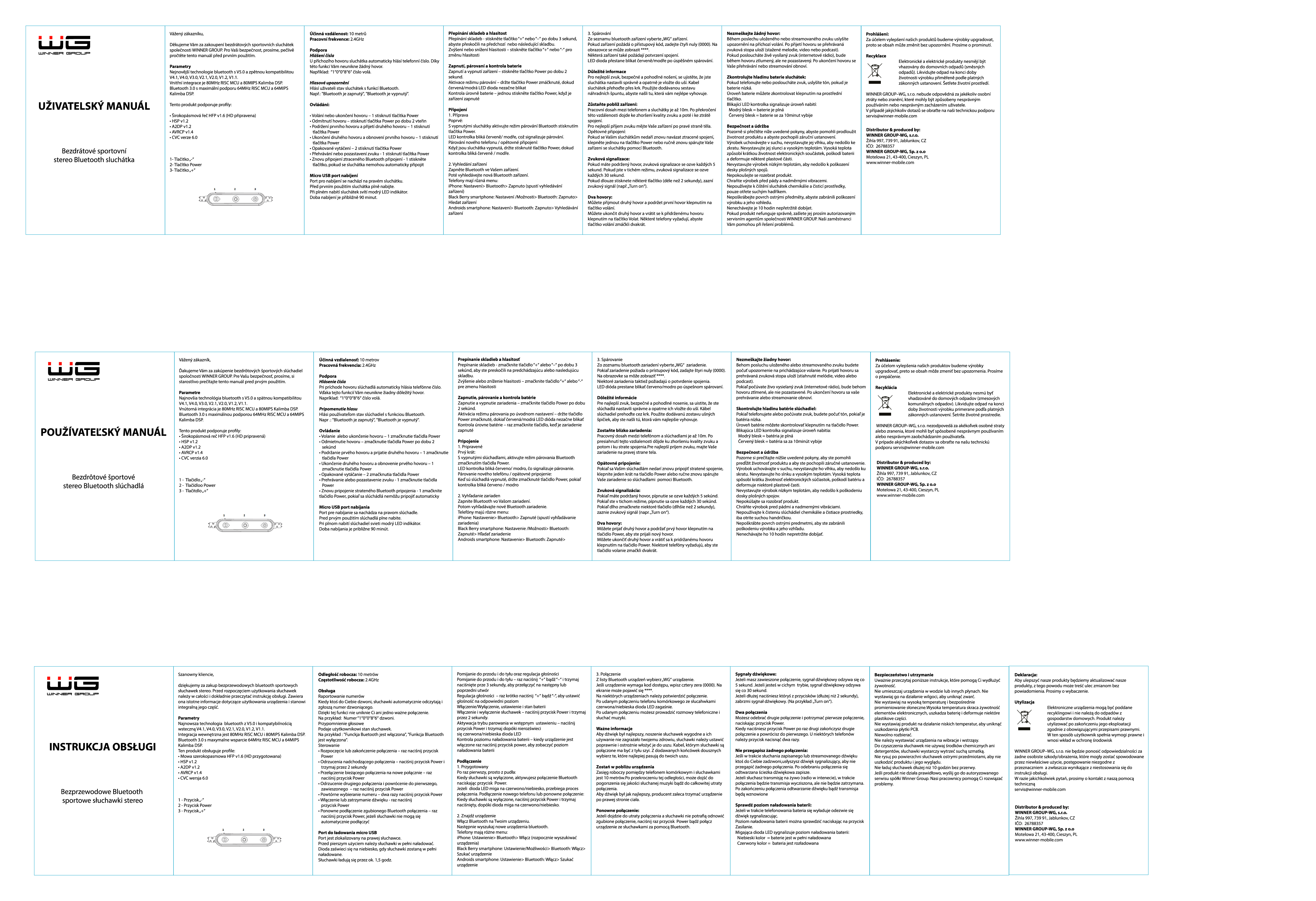 Połączenie Bluetooth Mikrofon Wbudowany Sportowe słuchawki douszne Lubisz spacerować, biegać, jeździć na rowerze? Jeśli słuchasz wtedy muzyki, na pewno przeszkadzają Ci przewody od słuchawek. W takim razie wybierz słuchawki bezprzewodowe, które sprawdzą się podczas wielu aktywności. Wygodne zaczepy utrzymują słuchawki w uchu, dzięki czemu będziesz mieć duży komfort przez wiele godzin. - Połączenie z telefonem przez Bluetooth Wygodne rozmowy Dzięki bezprzewodowym słuchawkom Winner Group nie musisz już wyjmować telefonu z kieszeni czy torby, aby odebrać połączenie. Zrobisz to za pomocą jednego przycisku na słuchawkach. W ten sam sposób możesz odrzucić i kończyć połączenie. Wysoką jakość rozmów zapewni Ci z kolei mikrofon z redukcją szumów i dobry dźwięk stereo. - Przycisk do obierania i kończenia połączeńEAN: 8591194085642