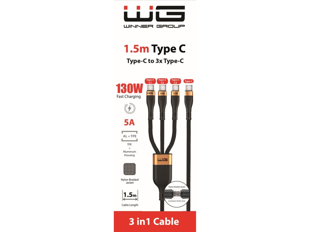 Kabel do transmisji danych 3w1 USB-C x 3x USB-C 1,5m 130W - czarny