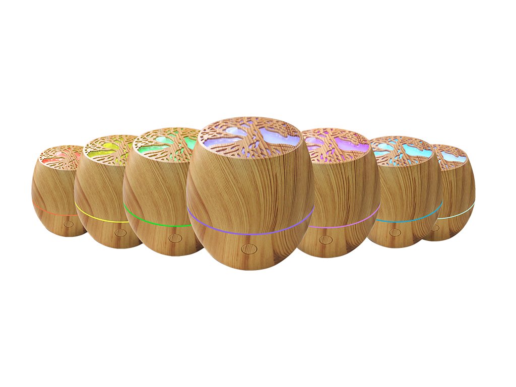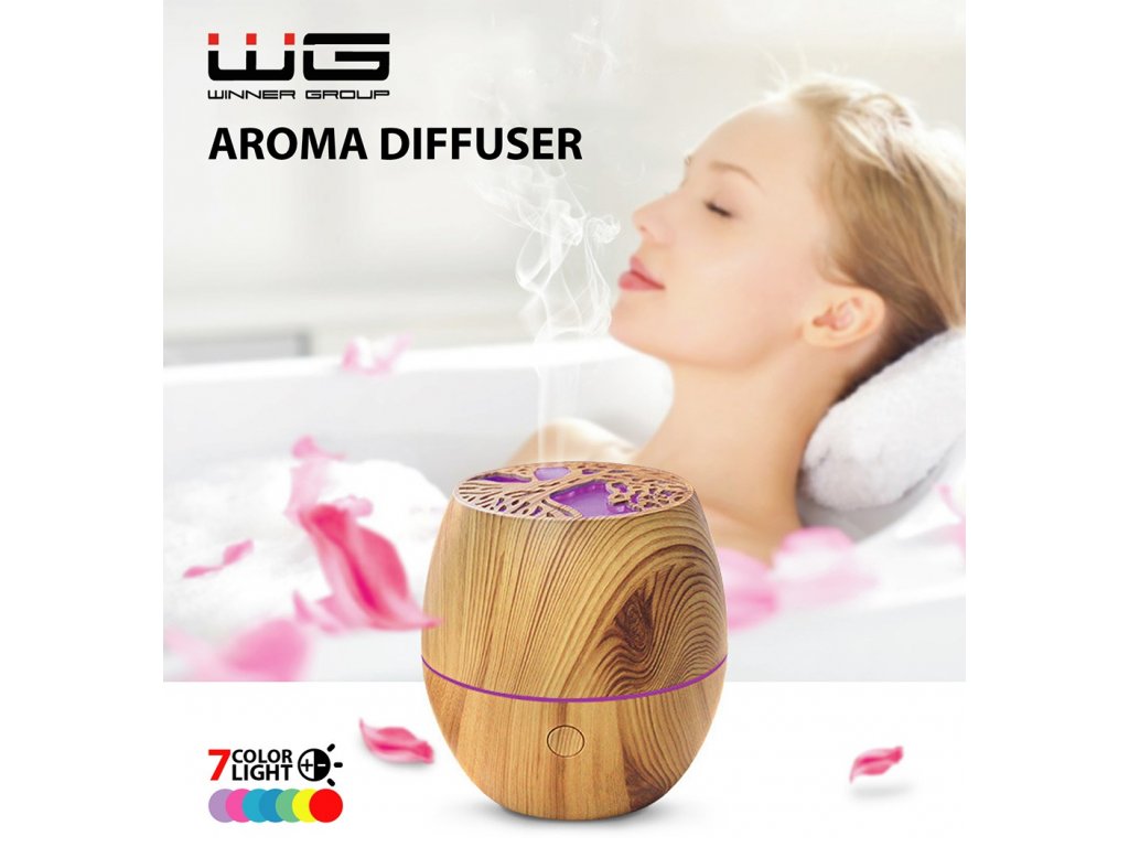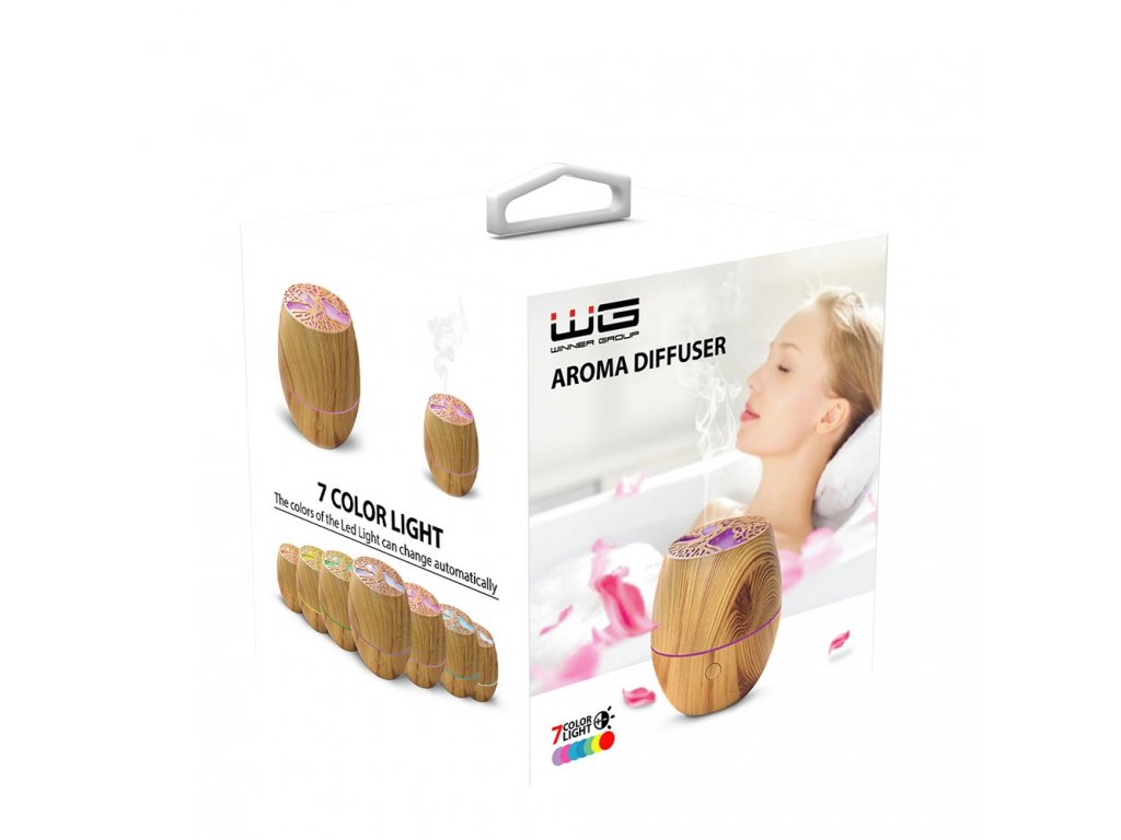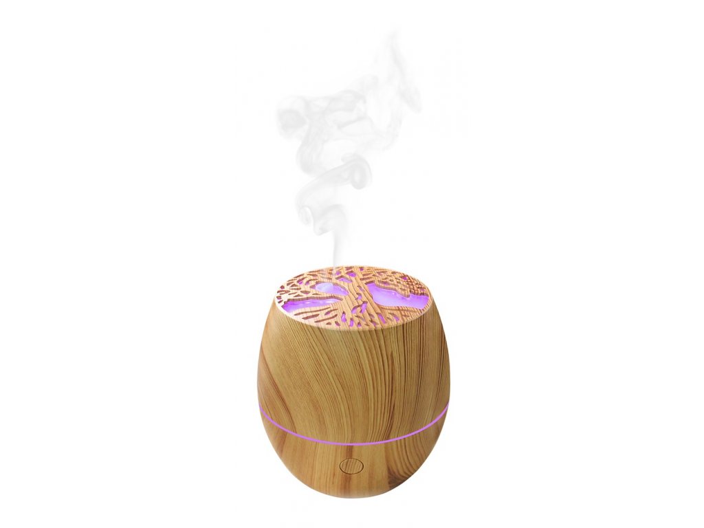 Ultradźwiękowy dyfuzor nawilżający powietrze z funkcją aromatyzera i wbudowaną lampką, dająca światło w jednym z siedmiu kolorów lub w harmonijnie zmieniających się kolorach, pomaga przywrócić odpowiednią wilgotność w wysuszonych pomieszczeniach, emitując chłodną mgiełkę; możliwość dodania olejków eterycznych, sprawdza się w zastosowaniach aromaterapeutycznych, gdyż olejki eteryczne pozytywnie wpływają na organizm i układ nerwowy.