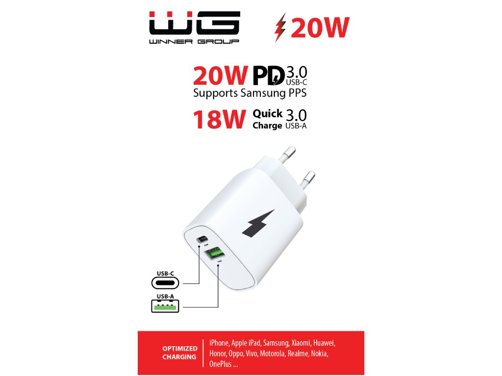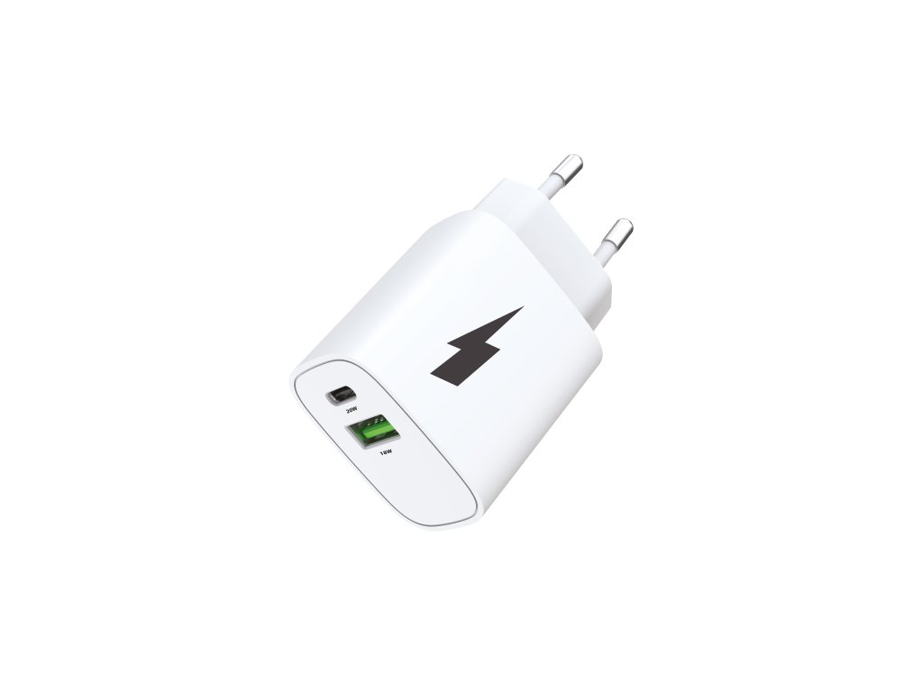Ładowarka sieciowa z dwoma portami USB, obsługą PD 20W oraz QC 3.0 o mocy 18W zapewnia wydajne i szybkie ładowanie Twoich urządzeń. Elegancki biały design sprawia, że jest doskonałym wyborem do codziennego użytku w domu, w pracy czy w podróży.