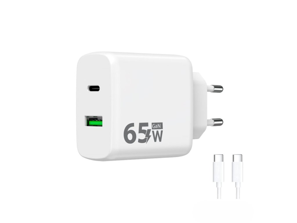 Kompaktowa, wydajna i odporna na przegrzewanie ładowarka sieciowa GaN 65W. Dzięki podwójnemu wyjściu USB-C i USB-A oferuje szerokie możliwości zastosowania dla smartfonów, tabletów i innych urządzeń elektronicznych.
