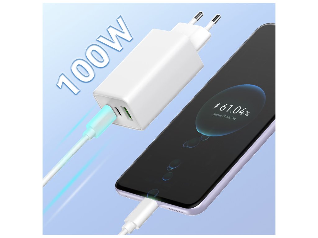 Ładowarka sieciowa GaN 100W to kompaktowe, wydajne i odporne na przegrzewanie urządzenie. Dzięki wyjściom 2x USB-C i 1x USB-A oferuje szerokie możliwości ładowania smartfonów, tabletów i innych urządzeń elektronicznych.