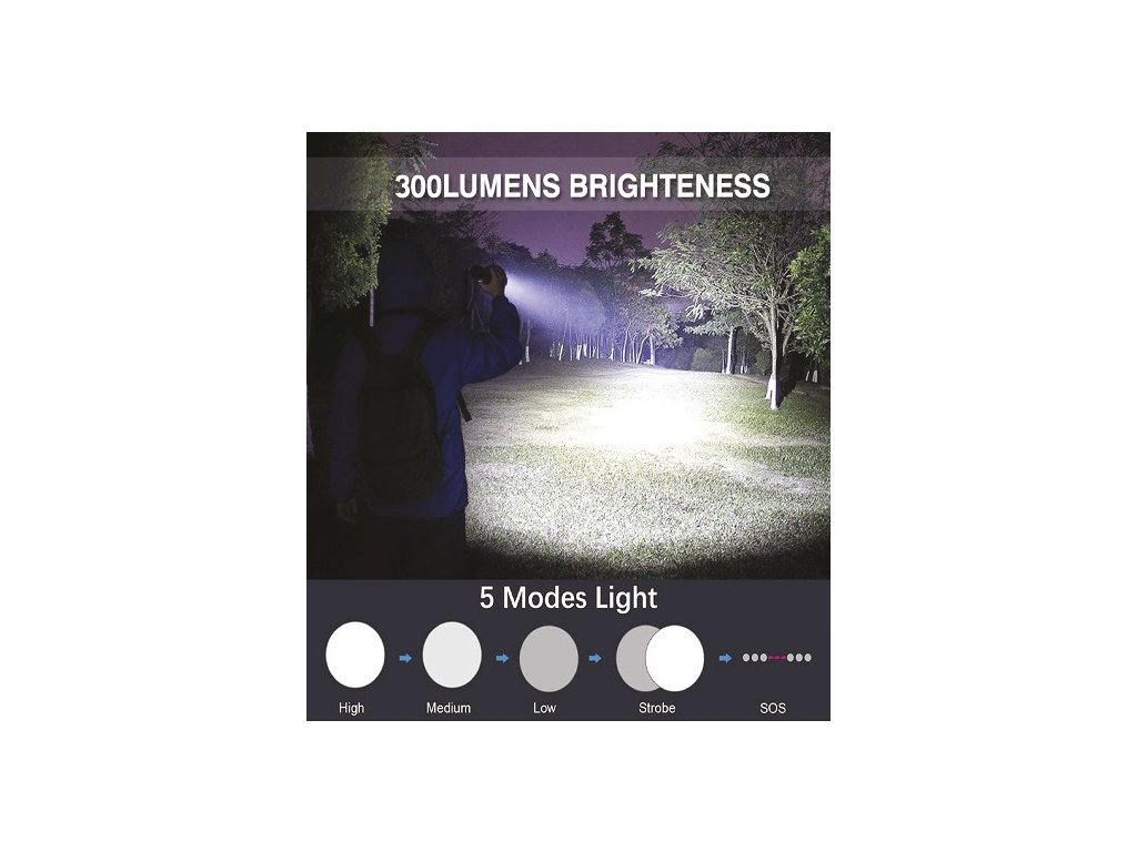 - Funkcje świecenia: 3 poziomy światła (mocny, średni, słaby), miganie, SOS.