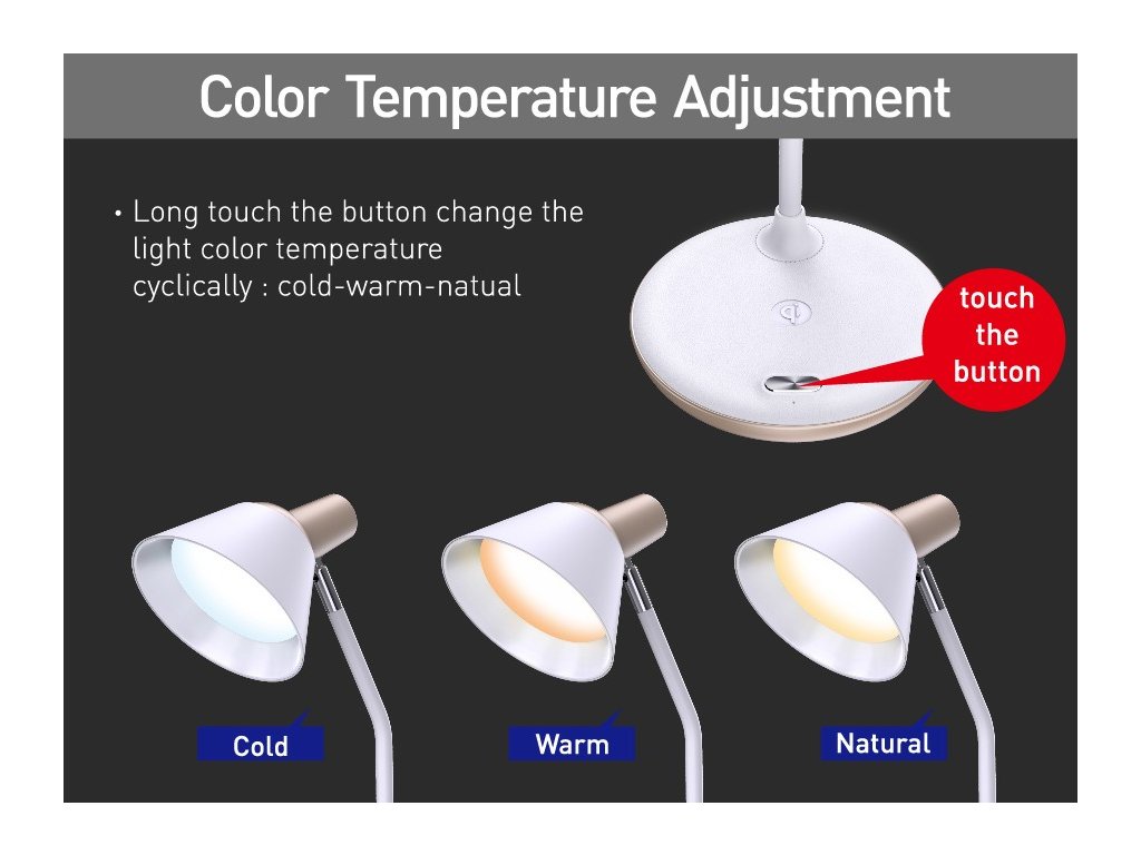 Dzięki zastosowaniu nowoczesnych diod LED lampa zapewnia jasne, energooszczędne oświetlenie przyjazne dla oczu. Oferuje trzy poziomy jasności oraz regulowany zakres oświetlenia: 45° w pionie i 180° w poziomie.