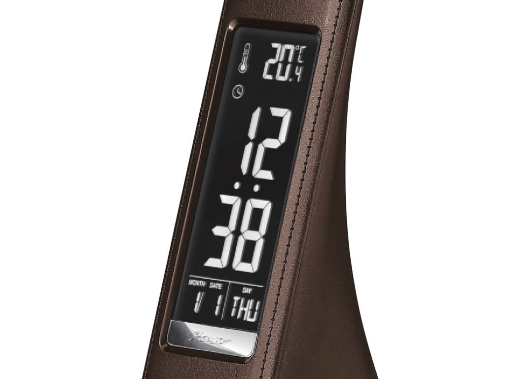Brąnzowa skórzana lampa stołowa LED z elastycznym ramieniem, które zapewnia oświetlenie wybranego miejsca. Równomierne i delikatne światło, które oszczędza oczy. Regulacja jasności na trzech poziomach. Wrażliwy panel dotykowy dla łatwej obsługi. Lampa wyposażona jest w wyświetlacz o wysokiej rozdzielczości, który pokazuje godzinę, budzik, kalendarz i temperaturę.