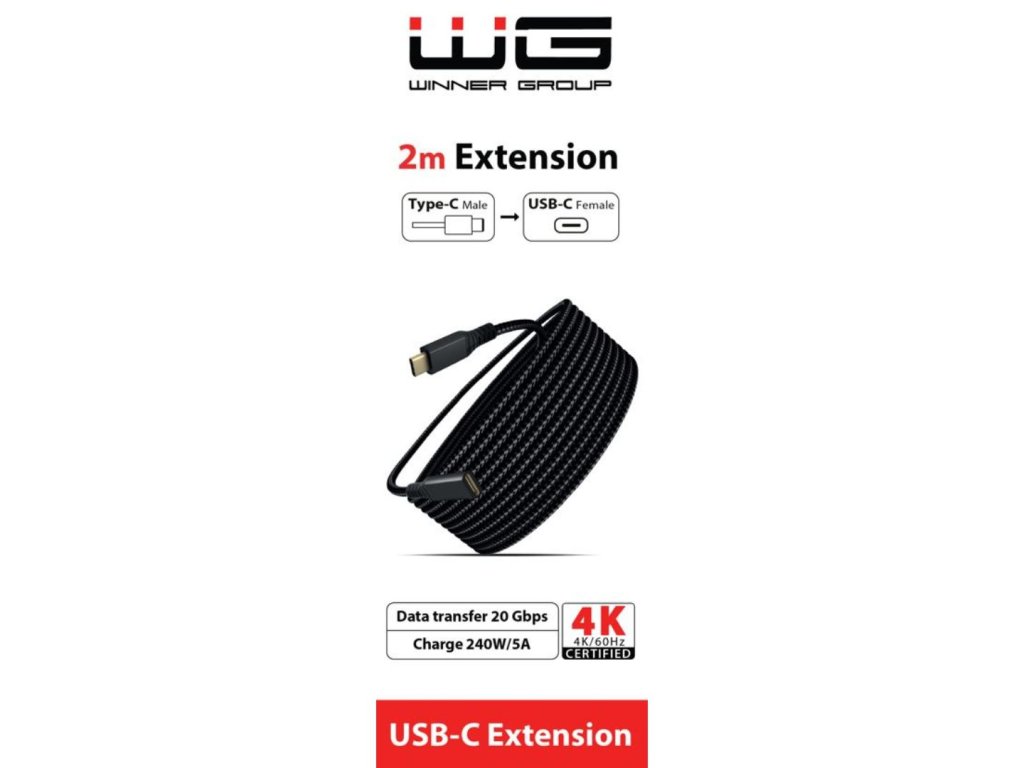 Przedłużacz USB-C 2m – 240W/5A, 20 Gbps, 4K/60Hz, w oplocie