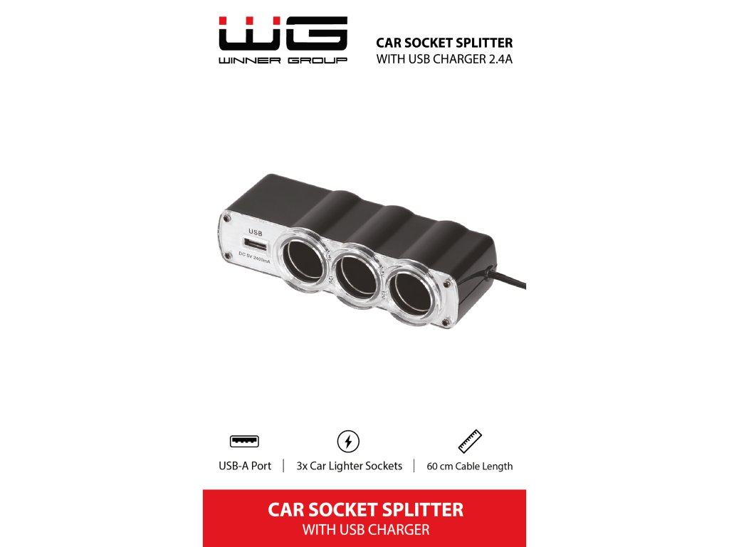 Rozdzielacz samochodowy z 3 gniazdami i ładowarką USB 2.4A – 12/24V