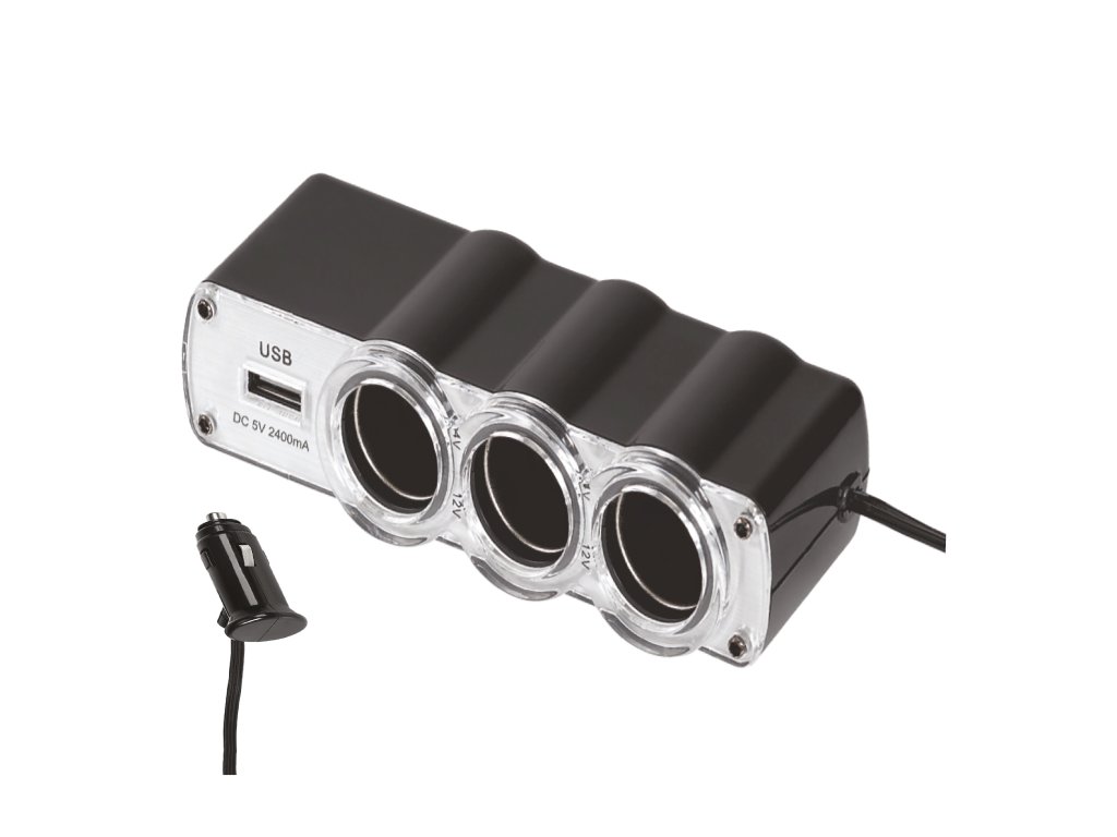 Praktyczny rozdzielacz do gniazda zapalniczki z portem USB umożliwia jednoczesne zasilanie i ładowanie aż czterech urządzeń – trzech przez standardowe gniazda zapalniczki i jednego przez port USB o mocy wyjściowej 5V/2.4A. Idealny dodatek do samochodów osobowych, ciężarówek, kamperów i przyczep.