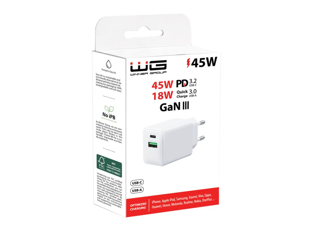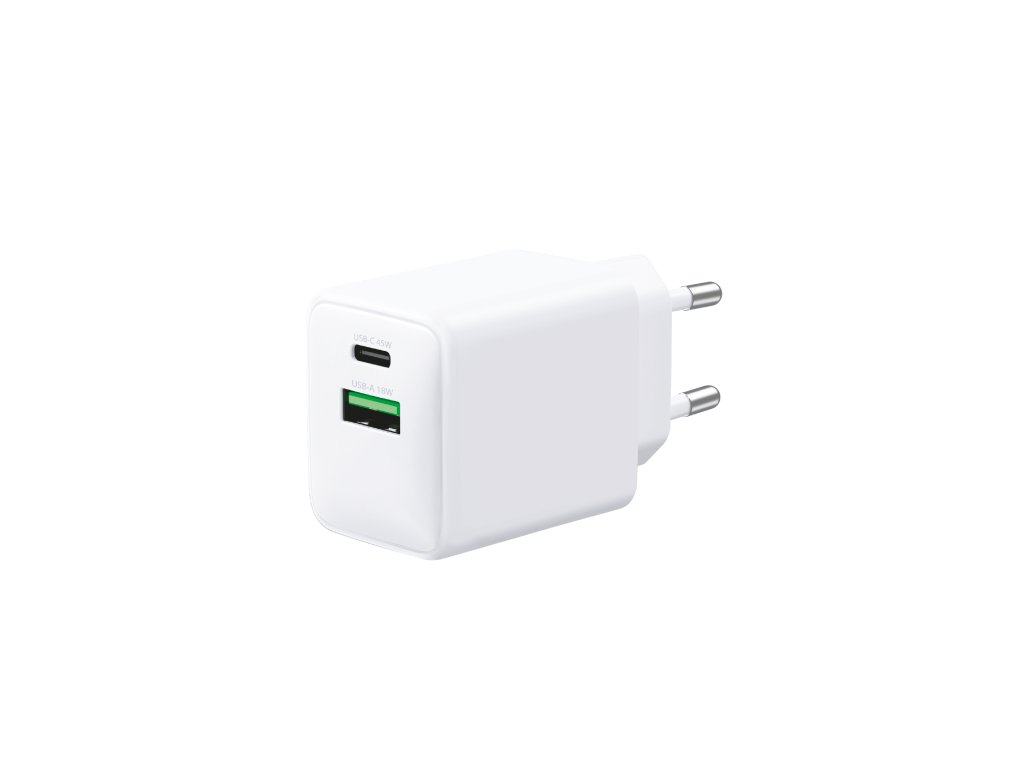 Ta wydajna ładowarka sieciowa umożliwia szybkie i efektywne ładowanie aż dwóch urządzeń jednocześnie. Wyposażona jest w jeden port USB-C z technologią Power Delivery 3.0 o mocy do 45W oraz jeden port USB-A z technologią Quick Charge 3.0 o mocy 18W. Dzięki obsłudze PPS (Programmable Power Supply) ładowarka inteligentnie dostosowuje napięcie i natężenie prądu, zapewniając optymalne i bezpieczne ładowanie – idealne dla nowoczesnych urządzeń.