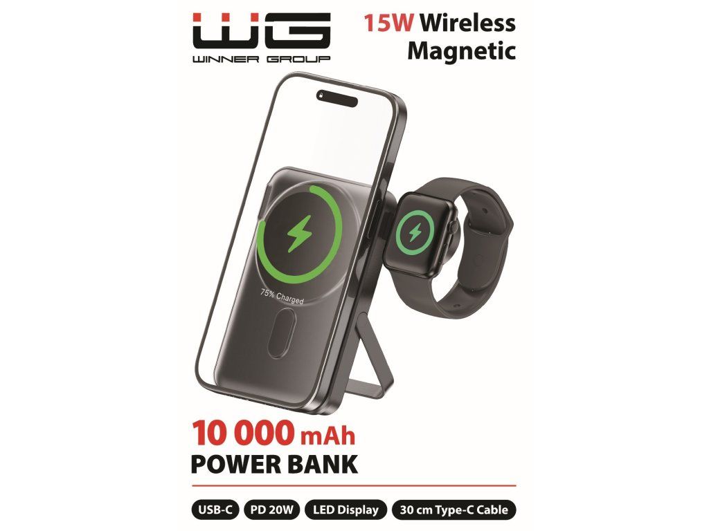 Praktická a výkonná powerbanka s kapacitou 10 000 mAh, která kombinuje bezdrátové magnetické nabíjení, rychlé kabelové dobíjení a integrovaný nabíjecí modul pro Apple Watch. Díky kompaktním rozměrům a sklopnému stojánku je ideálním společníkem na cesty, do práce i na každodenní použití. Nabíjí pohodlně bez kabelů a zároveň nabízí USB-C výstup s výkonem až 20 W Power Delivery.