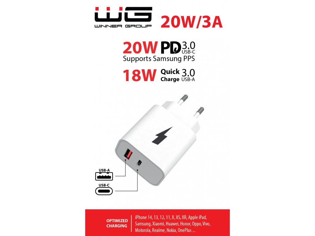 Síťová nabíječka s dvěma USB porty, podporou PD 20W a QC3,0 s výkonem 18W nabízí efektivní nabíjení pro vaše zařízení. Elegantní bílý design nabíječky je ideální pro každodenní použití doma nebo na cestách.