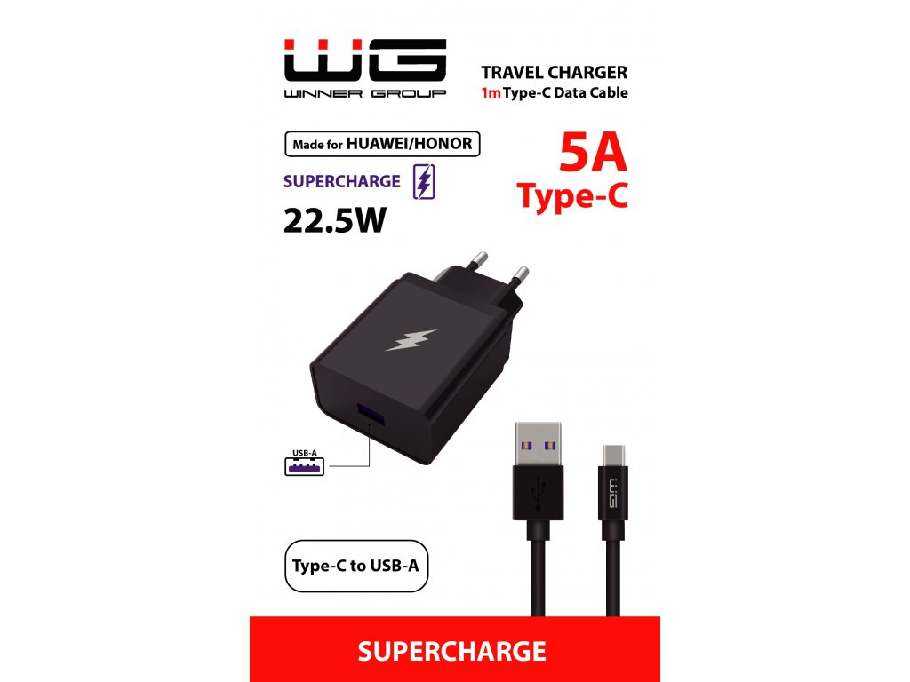 Síťová nabíječka je vybavena podporou rychlého nabíjení Huawei/Honor SuperCharge. Umožní vám tak nabíjet podporované modely maximální rychlostí. Maximální výkon nabíjení je 22,5 W. Součástí balení je také USB-C kabel, který je možné využívat k nabíjení i k vysokorychlostnímu přenosu dat.